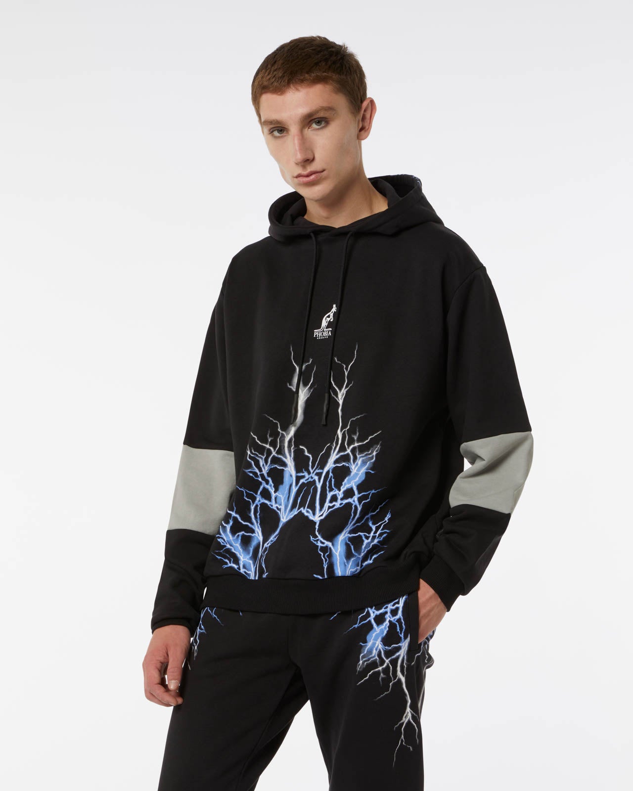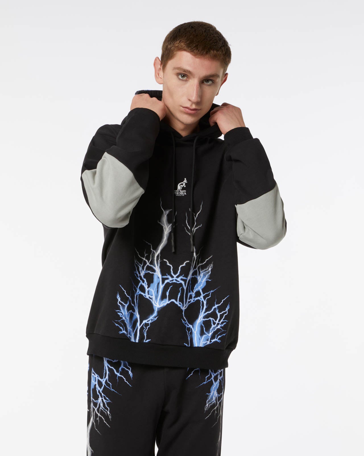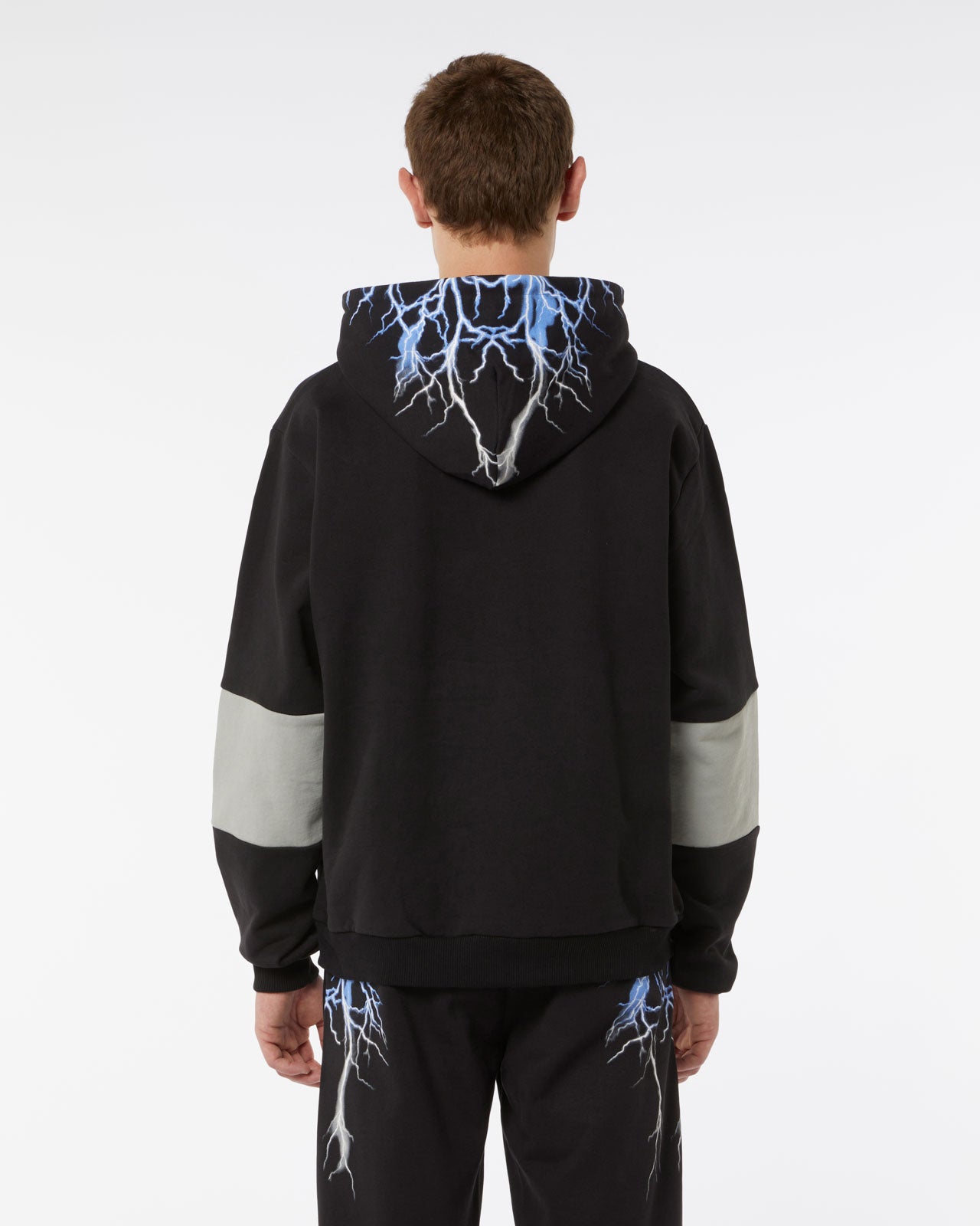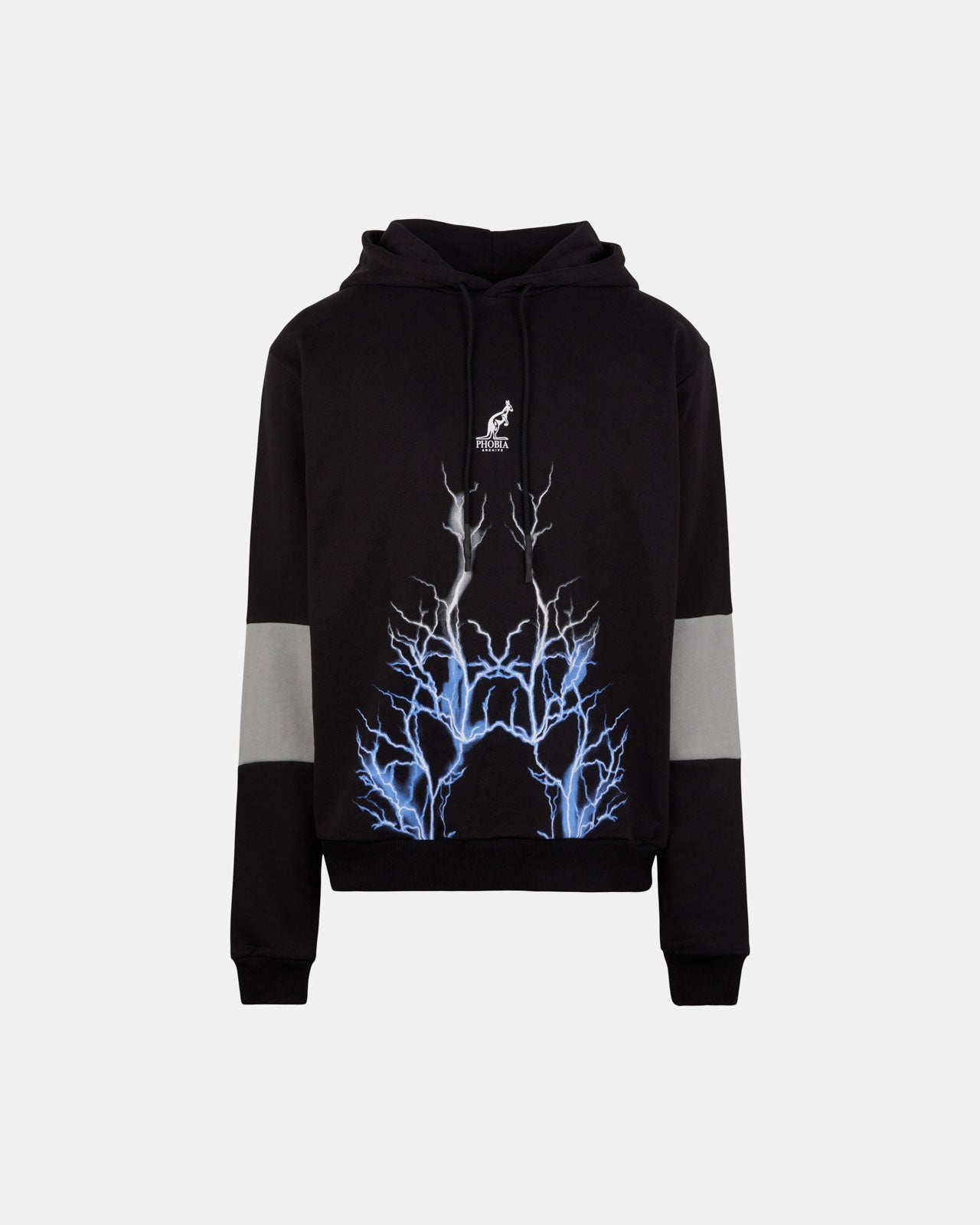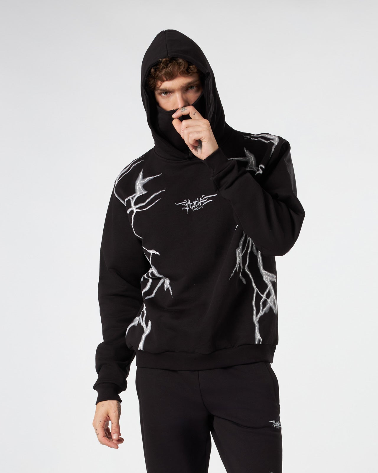 BLACK BALACLAVA HOODIE WITH LIGHTNING GREY PRINT