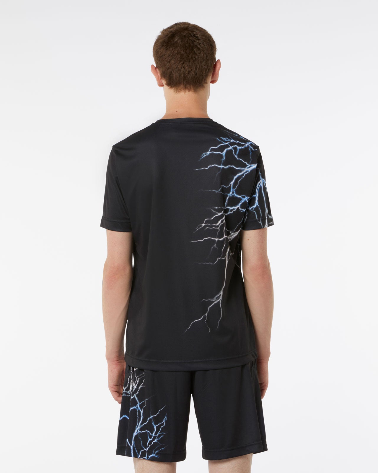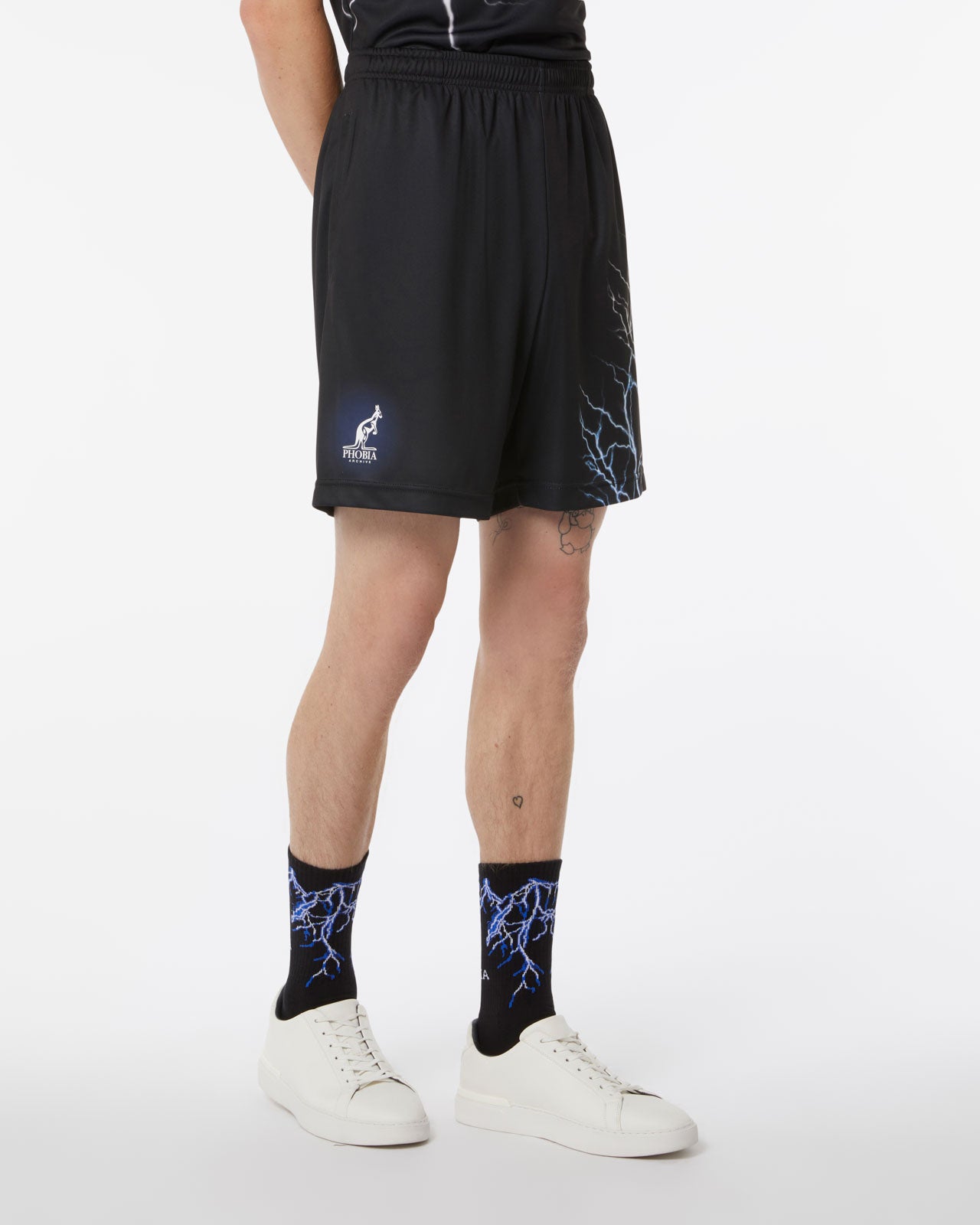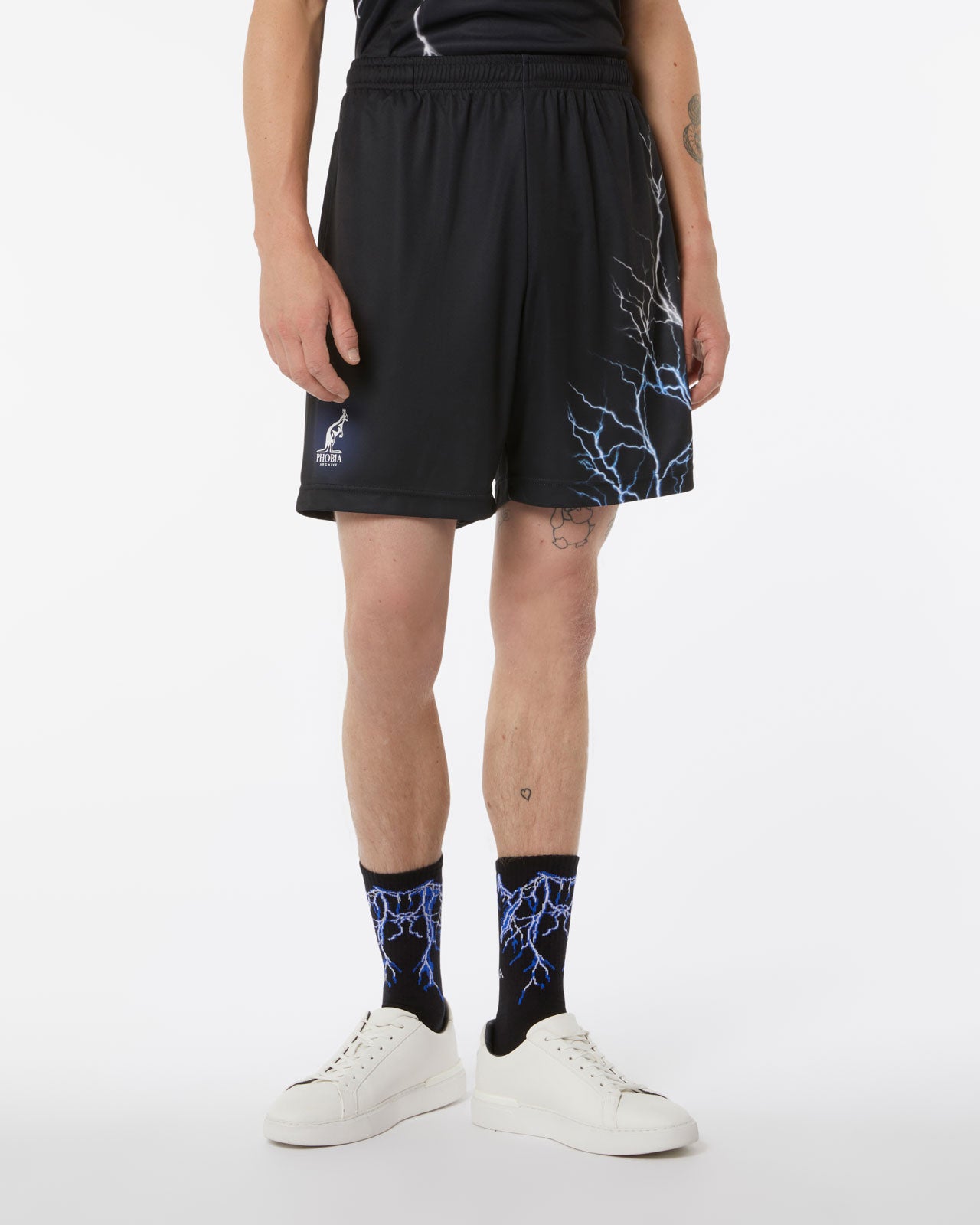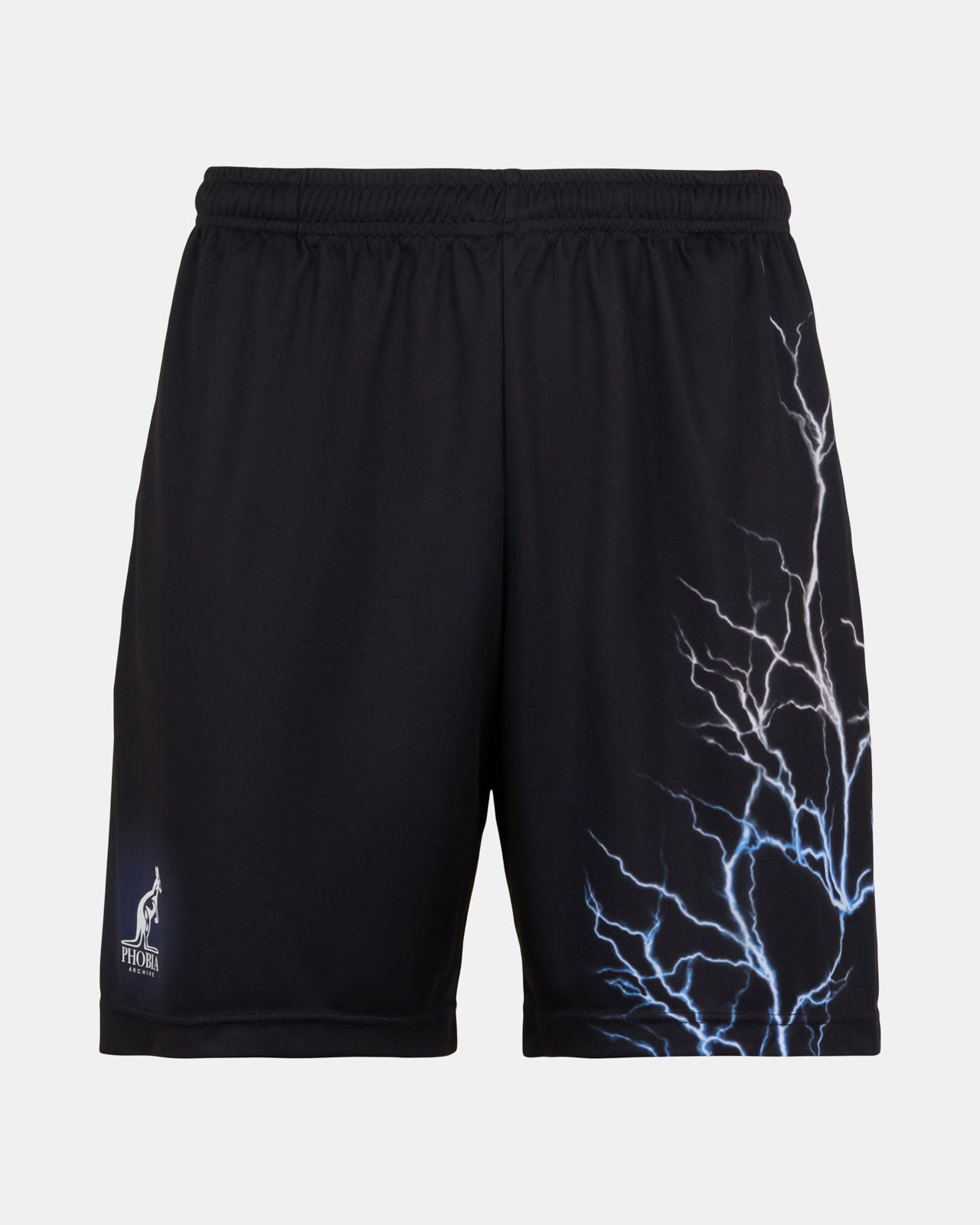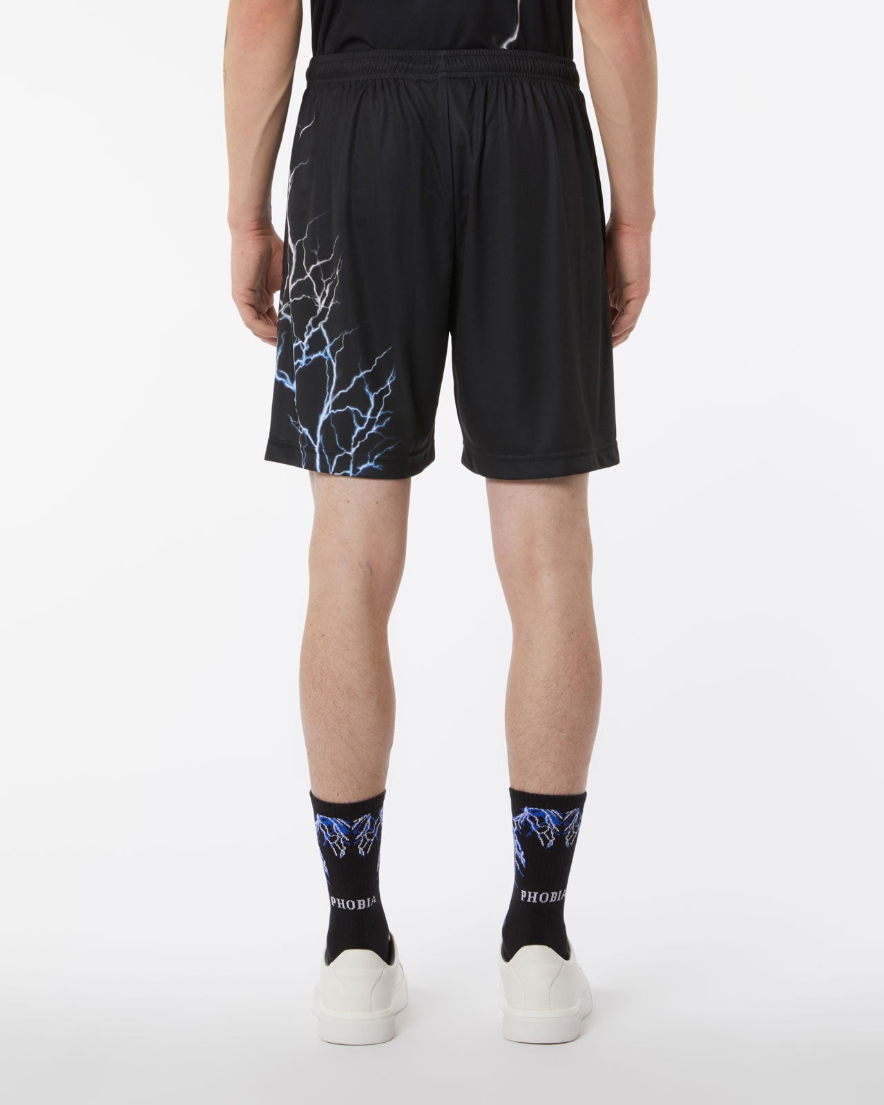BLACK BASKET SHORTS WITH WHITE LIGHTNING ALL OVER AND EMBROIDERED LOGO