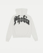 This white cotton hoodie features a printed Foggy Phobia logo on the back.