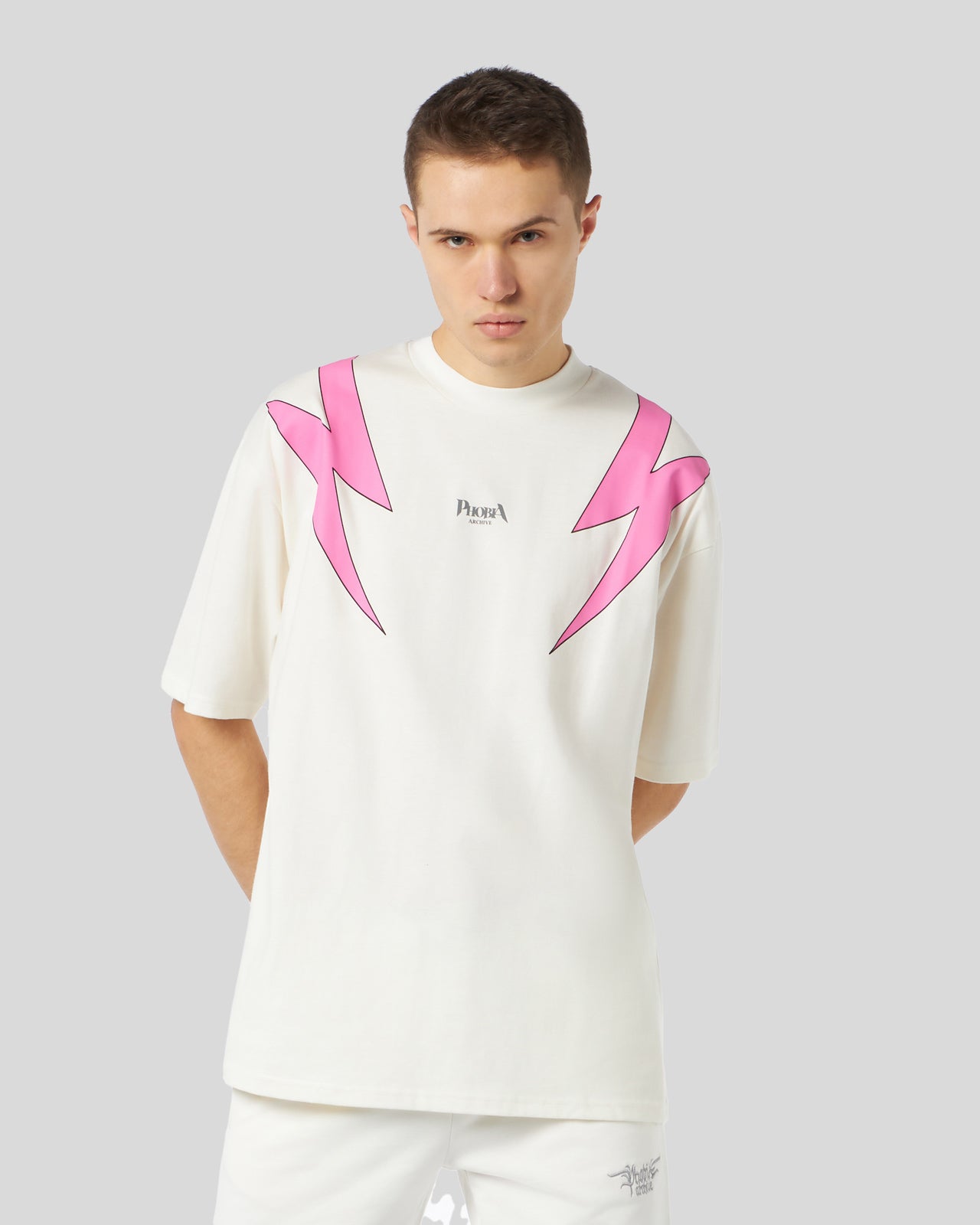 WHITE T-SHIRT WITH LATERAL PINK LIGHTNING PRINT AND EMBROIDERY GOTHIC LOGO