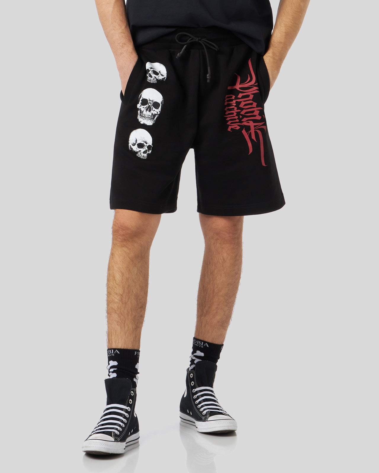 PANTALONCINO NERO CON GRAFICA TRIPLE SKULL ROSSA