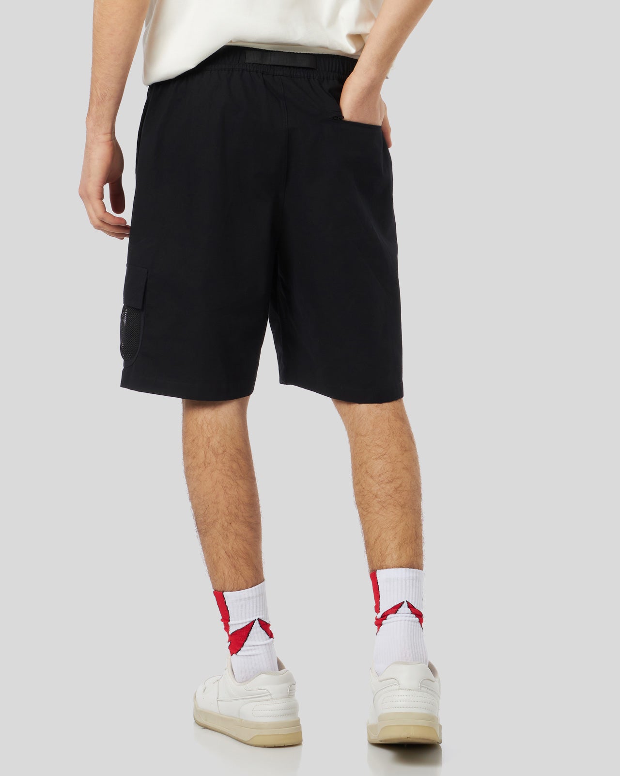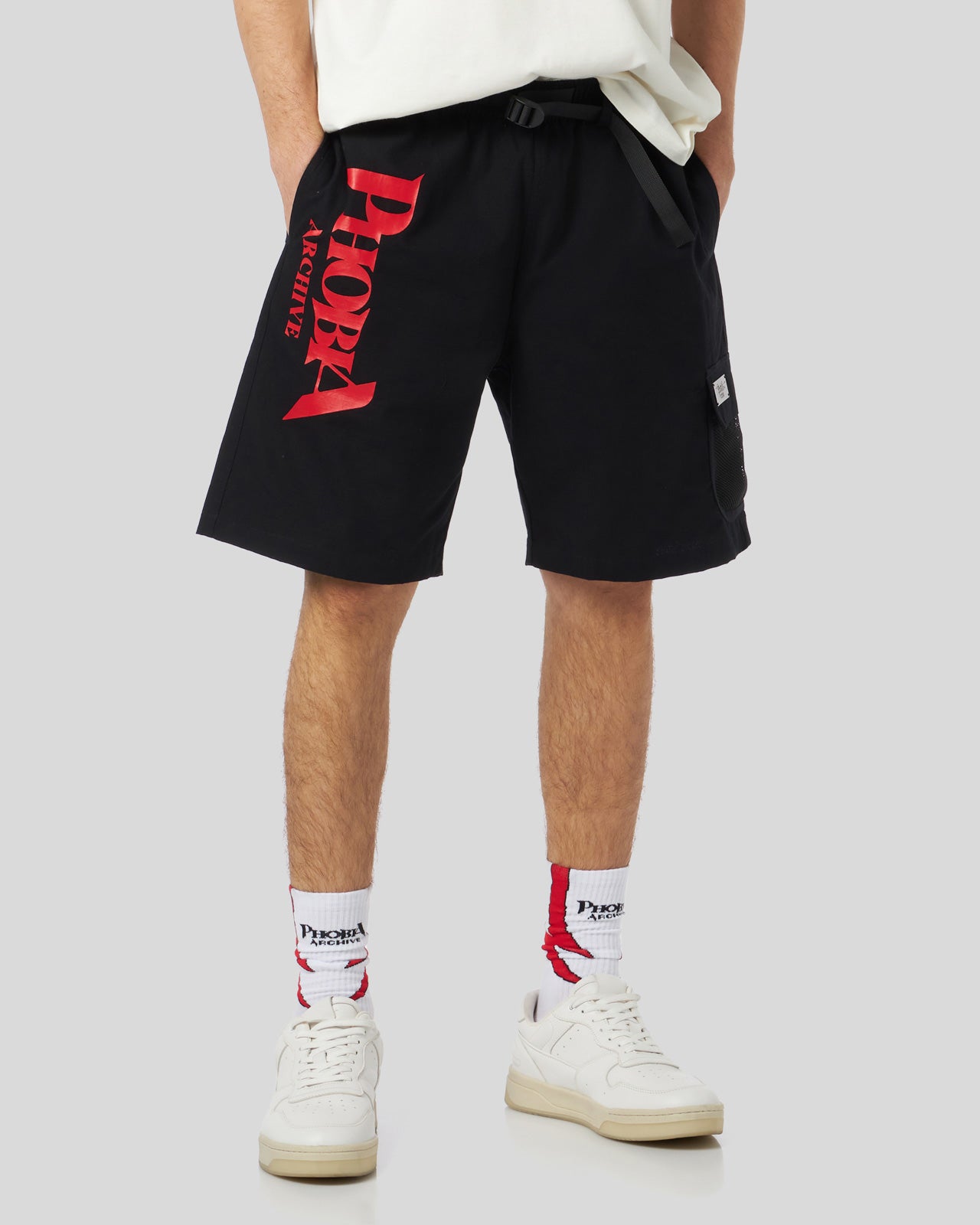 BLACK SHORTS WITH RED BIG LOGO PRINT ON FRONT