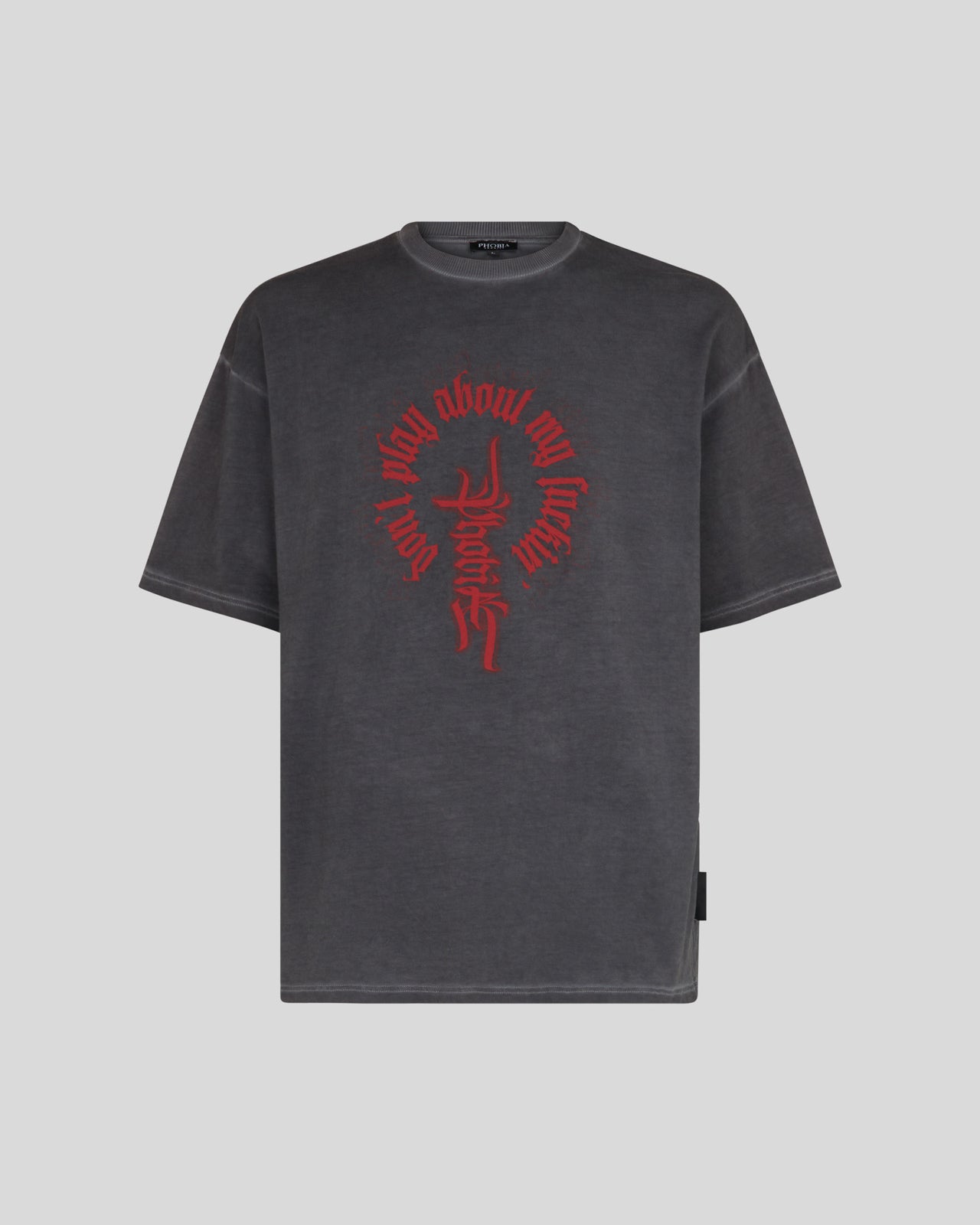Maglietta grigia con grafica “Don’t play about my fucking Phobia”, ispirata a una delle fobie di Emis Killa.
