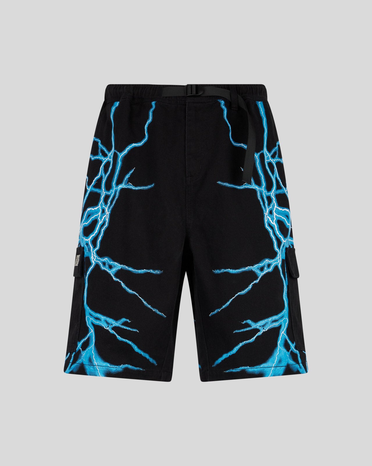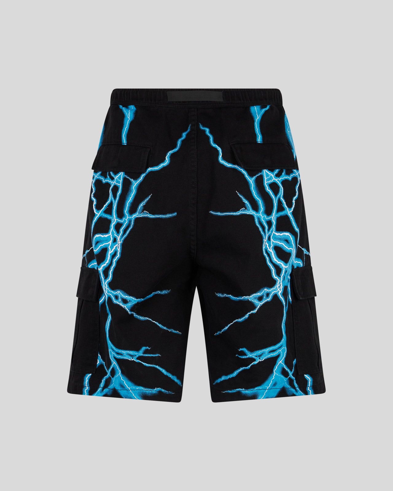 Pantaloncino cargo nero con fulmini laterali in stampa serigrafica azzurra ed etichetta in metallo