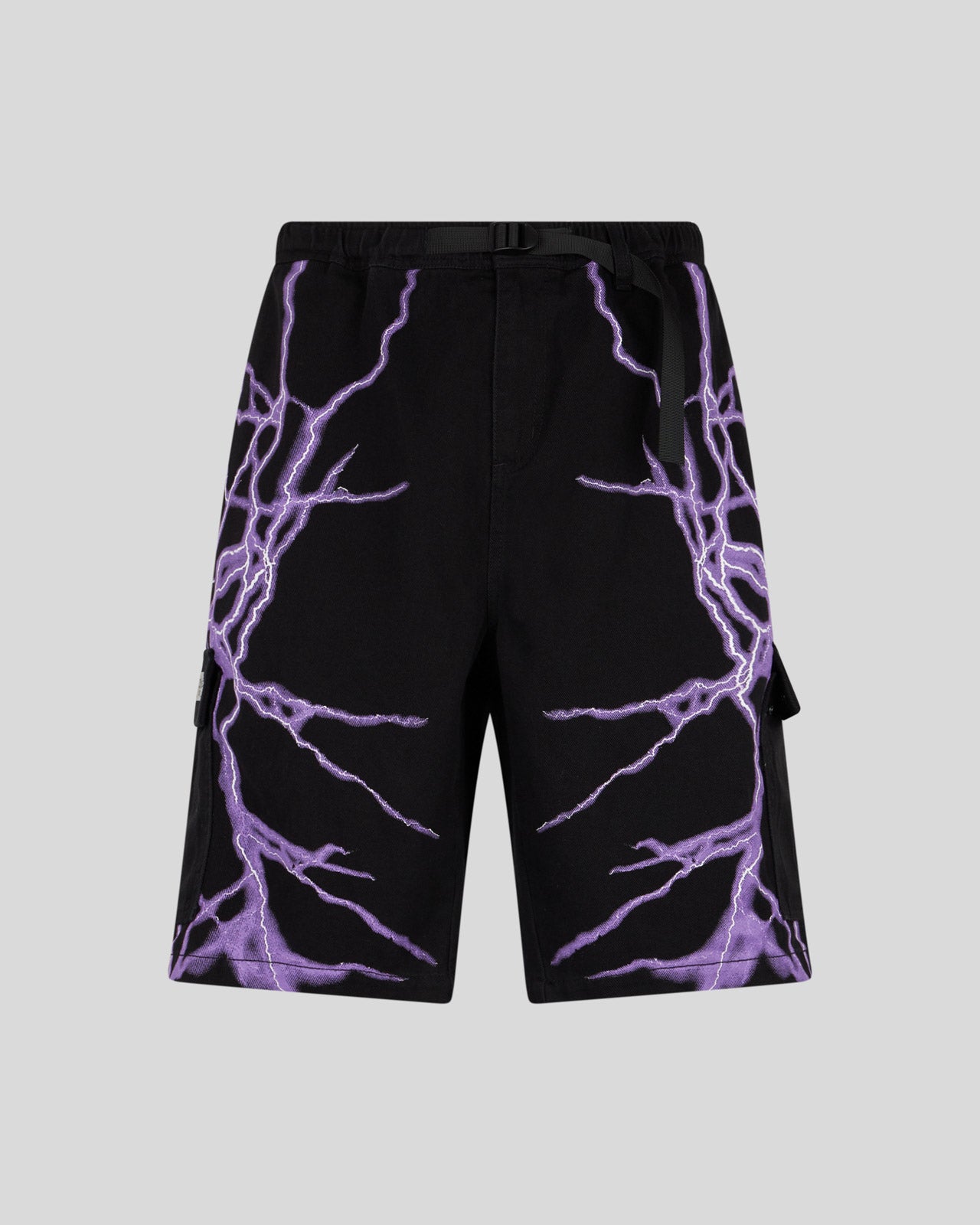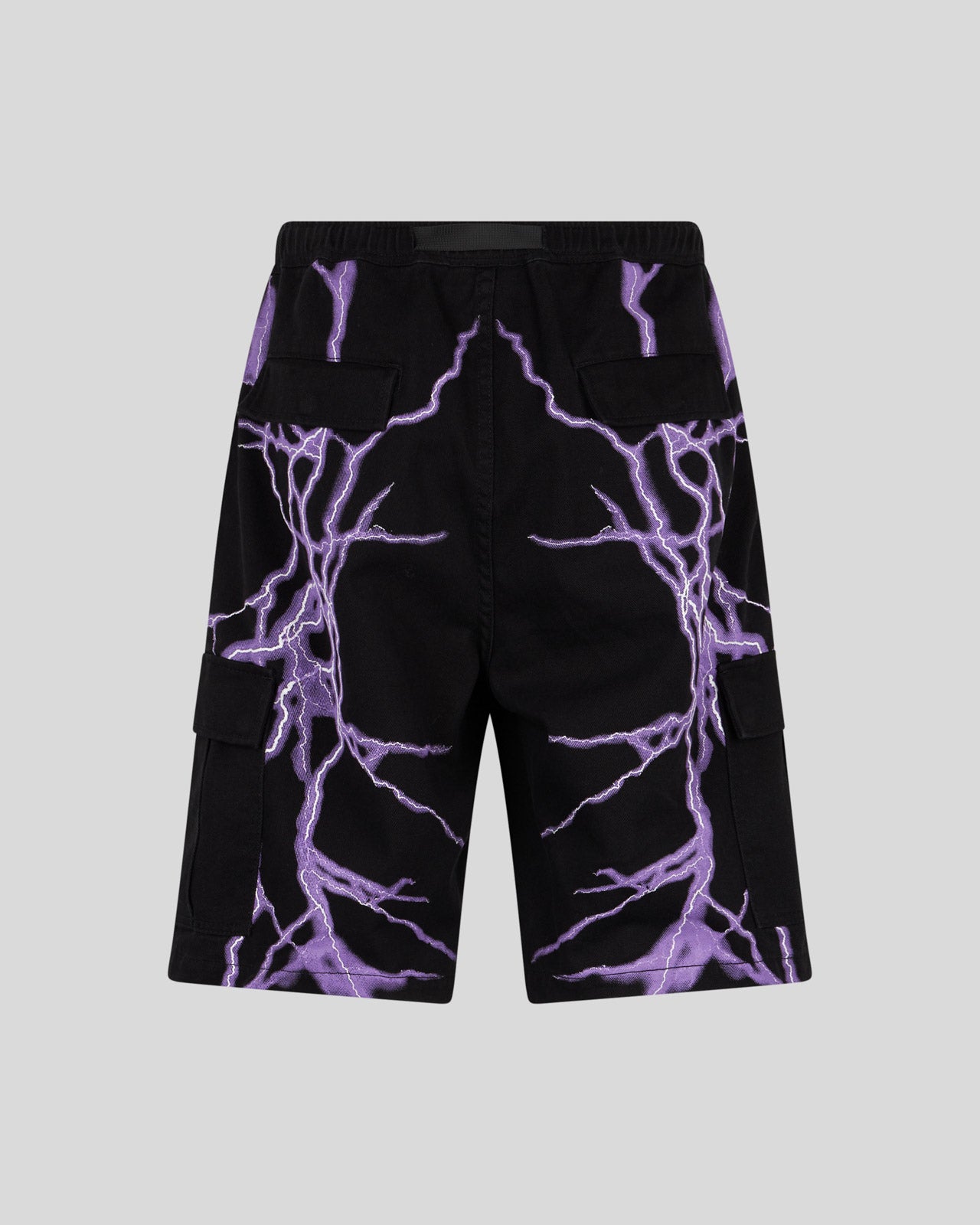 Pantaloncino cargo nero con fulmini laterali in stampa serigrafica viola ed etichetta in metallo
