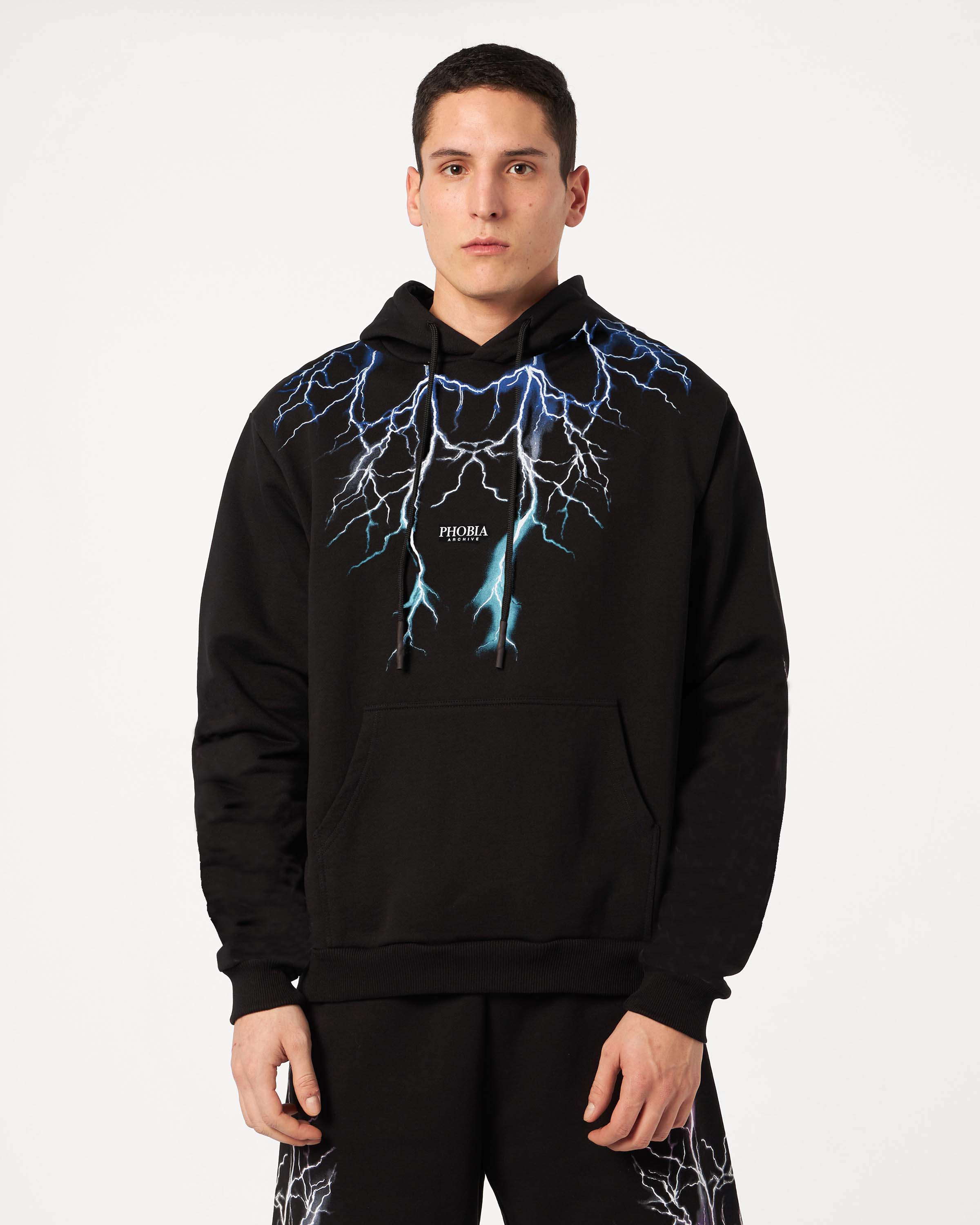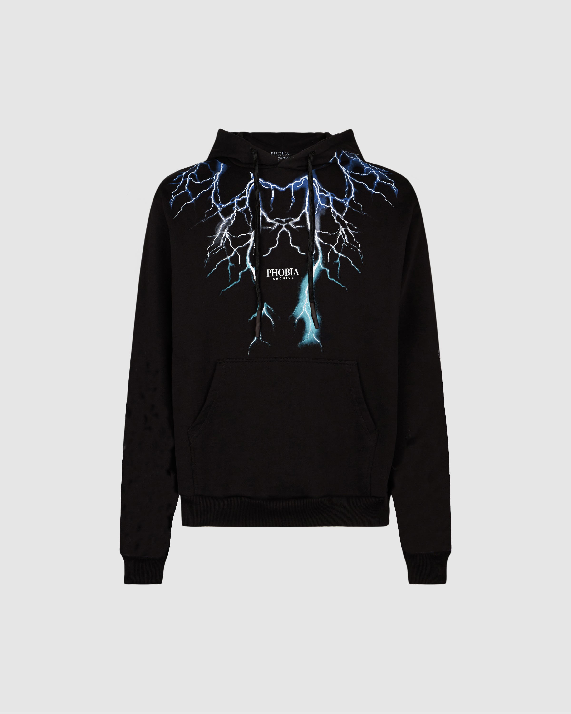 Felpa con cappuccio Phobia Archive nera con grafica Lightning in stampa serigrafica blu, grigia e azzurra su entrambe le maniche.