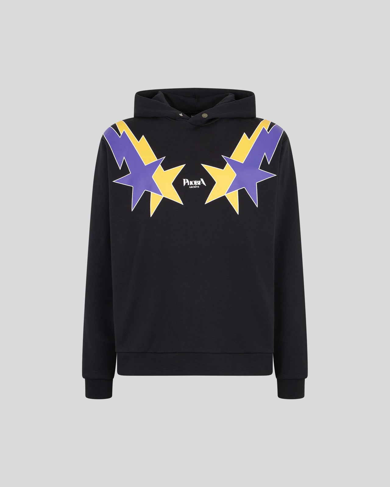 Felpa con cappuccio nera con grafica Starry Lightning in stampa serigrafica gialla e viola e bottone in metallo