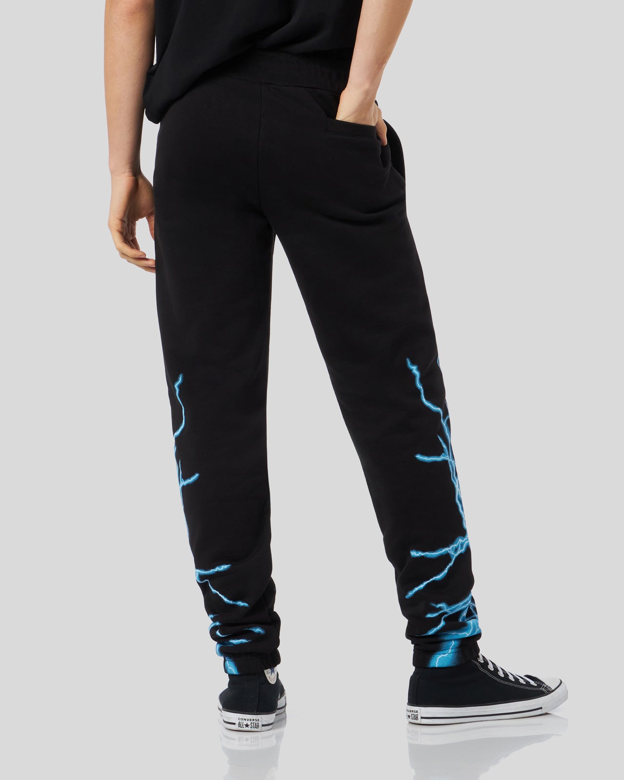 Pantalone nero con fulmini laterali in stampa serigrafica blu e logo gotico ricamato