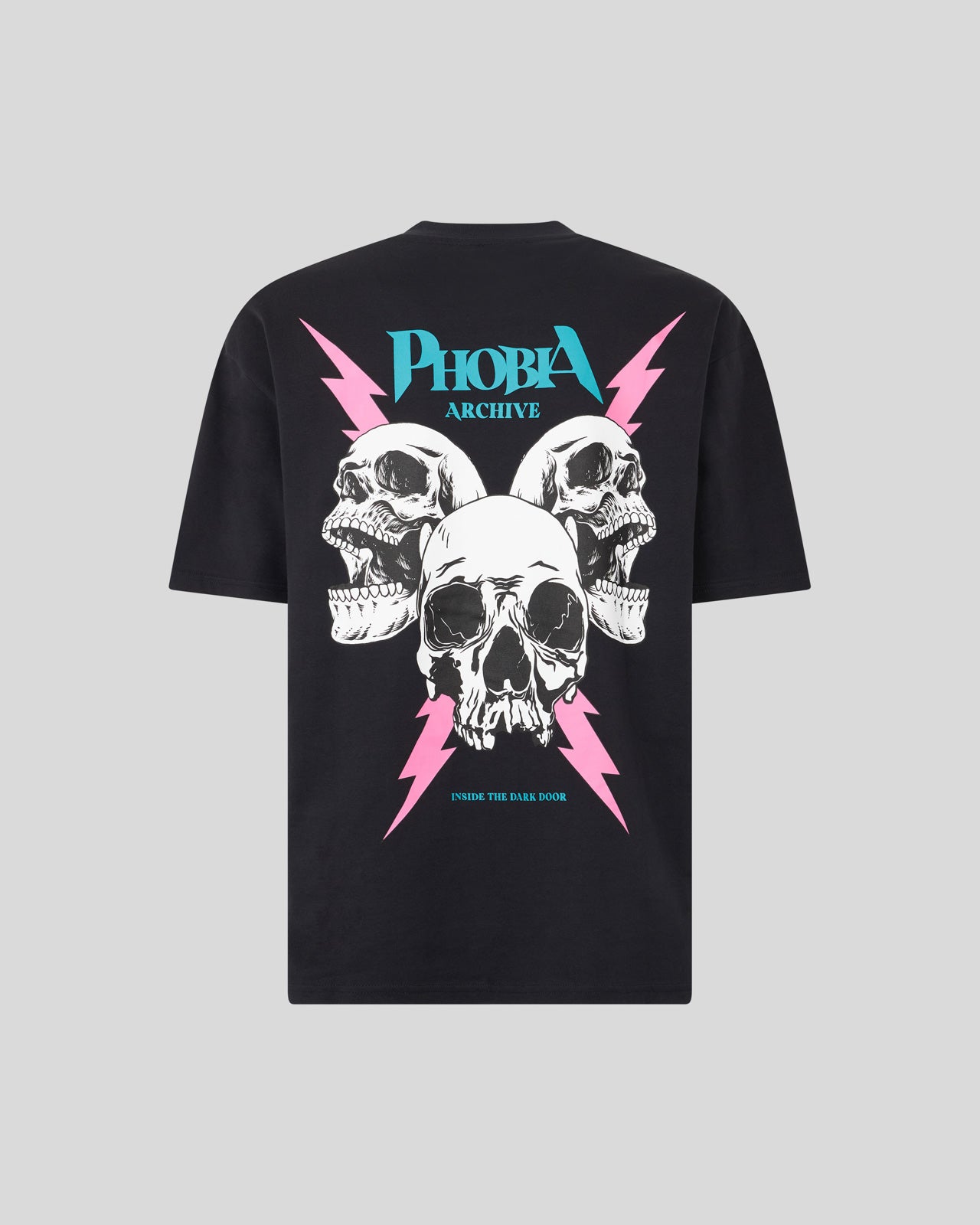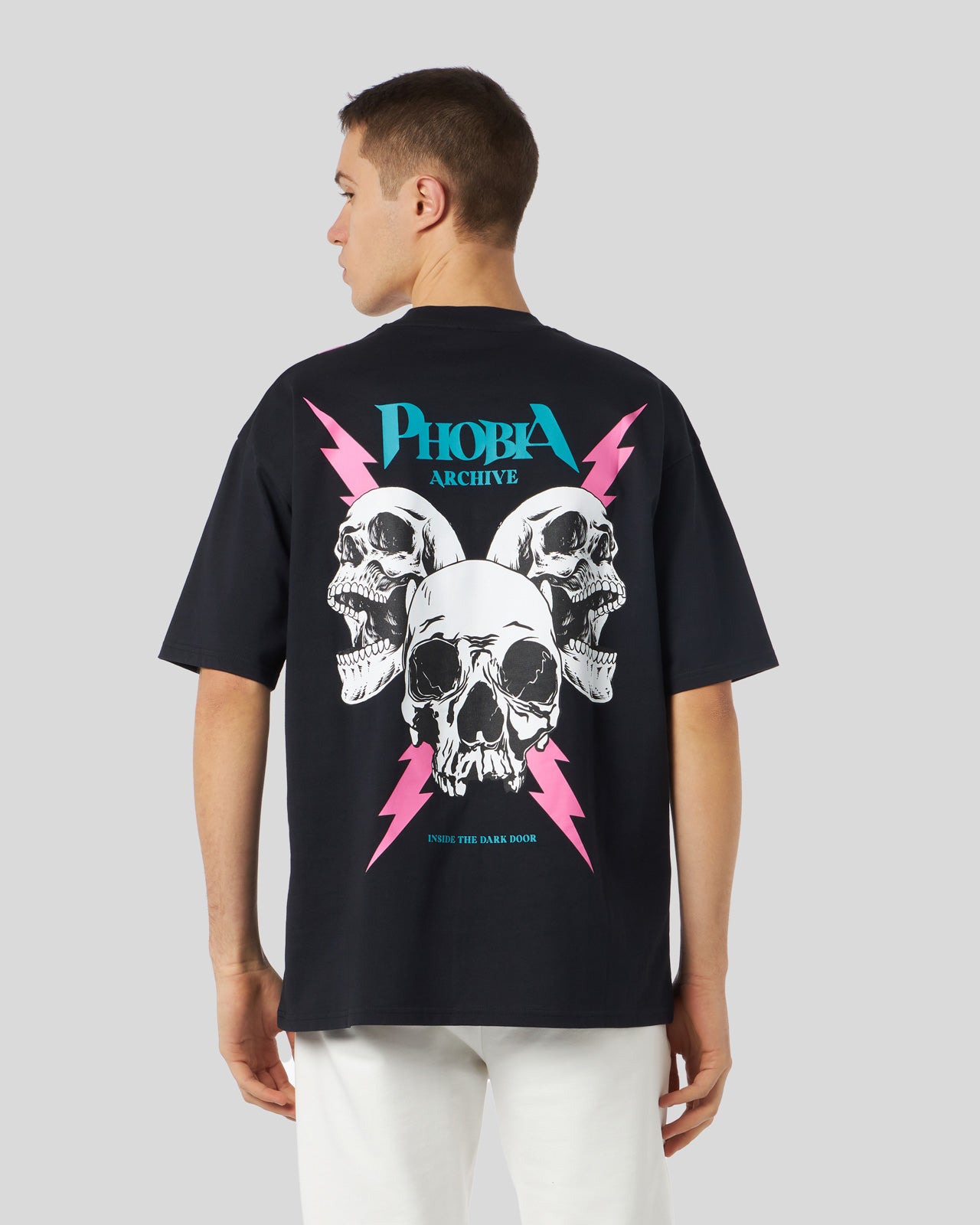 T-shirt nera con grafica Screaming Skulls in stampa serigrafica rosa