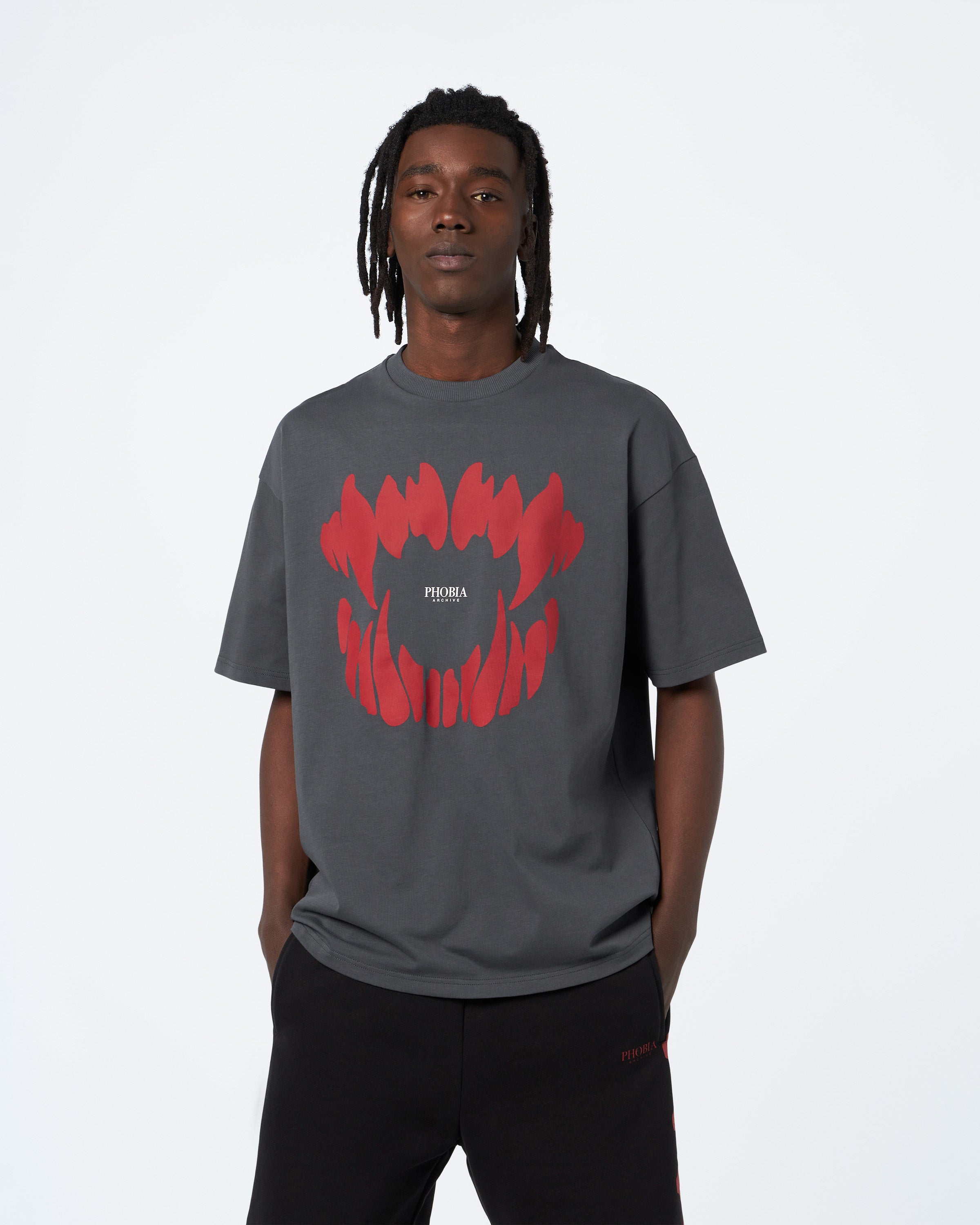 T-shirt Phobia Archive grigia con grafica Demon Bite in stampa serigrafica posizionata sulla parte anteriore.