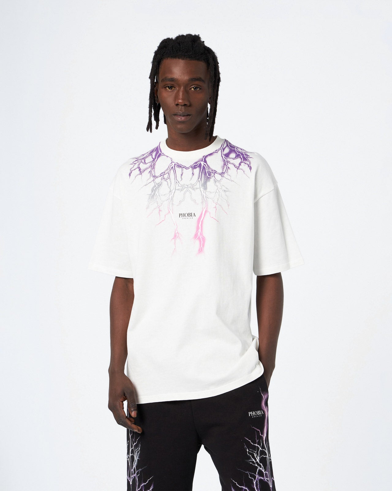 T-shirt Phobia Archive bianca con grafica Lightning in stampa serigrafica viola, grigia e fucsia a partire dal girocollo.