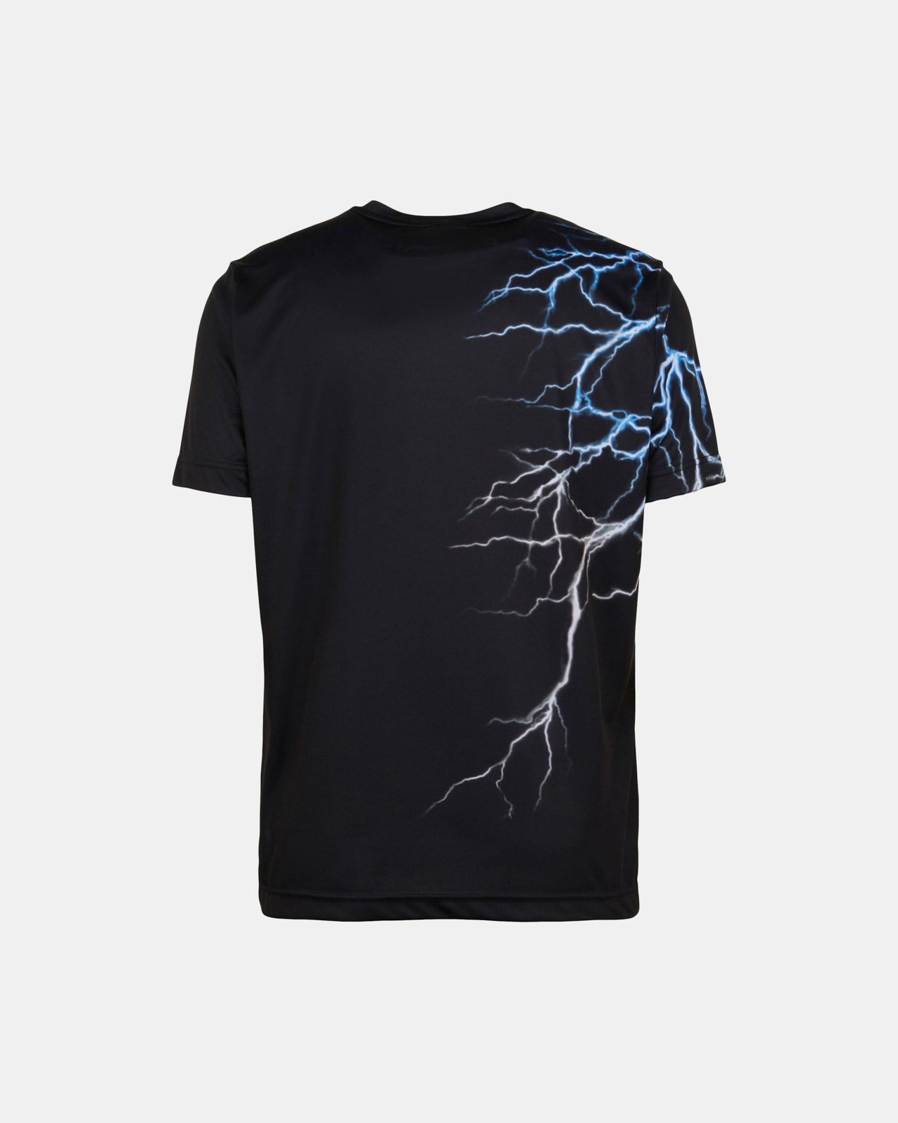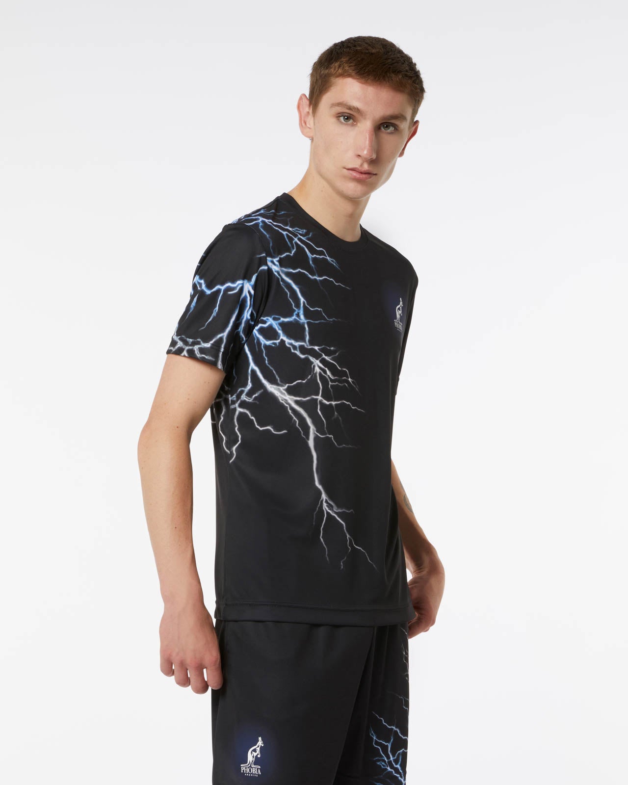 T-shirt nera collezione speciale Australian / Phobia Archive. Questa speciale collezione in edizione limitata, nata in collaborazione con Australian per avvicinare il mondo streetwear di Phobia Archive agli elementi sportivi di Australian. Sulla parte frontale della maglietta è stampata la nostra grafica iconica: i fulmini che sfumano dall’azzurro al grigio. La vestibilità della maglietta è regolare, i loghi dei due brand sono posizionati sul fronte ad altezza petto. Inoltre è presente un inserto grigio a partire dalle spalle su entrambe le maniche.
