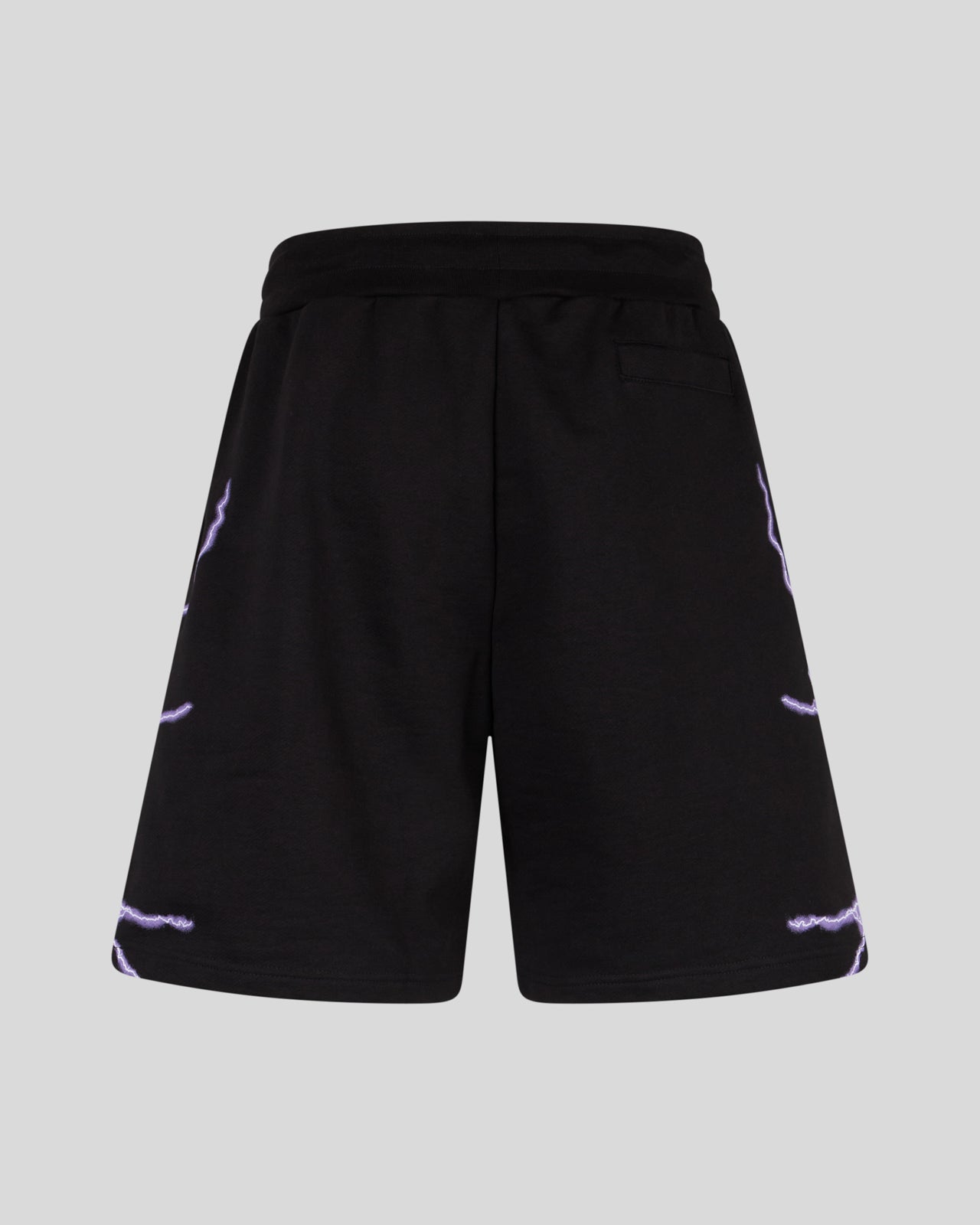 Pantaloncino nero con fulmini laterali in stampa serigrafica viola e logo gotico ricamato