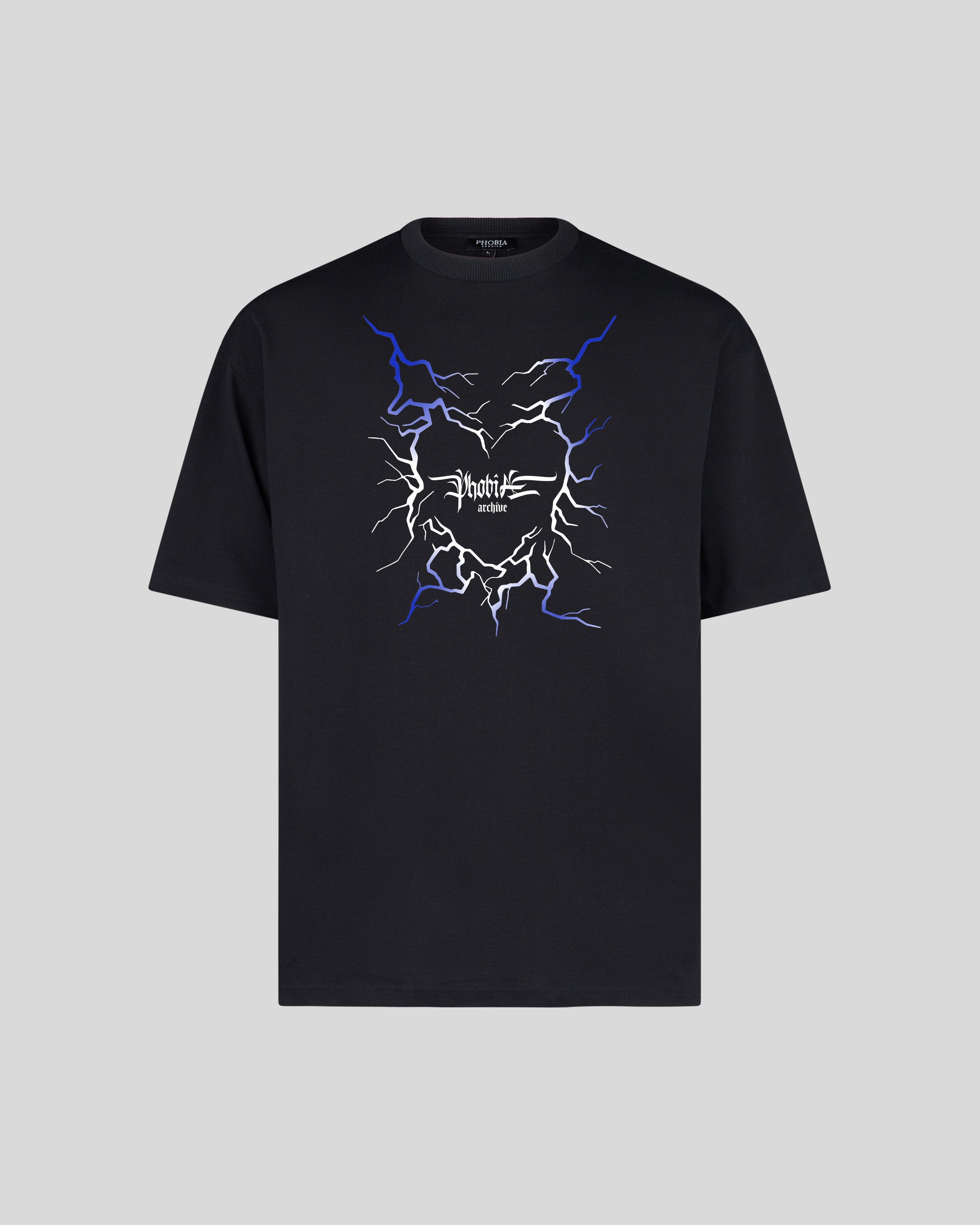 T-shirt nera con grafica Cuore Lightning blu in stampa digitale di alta qualità.