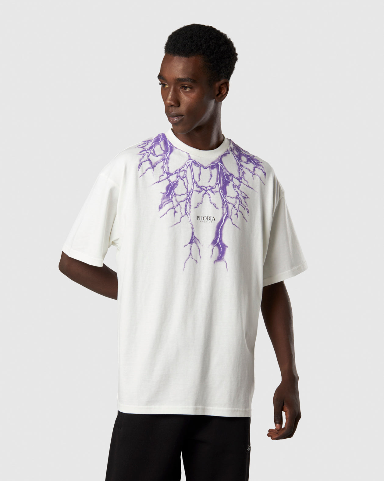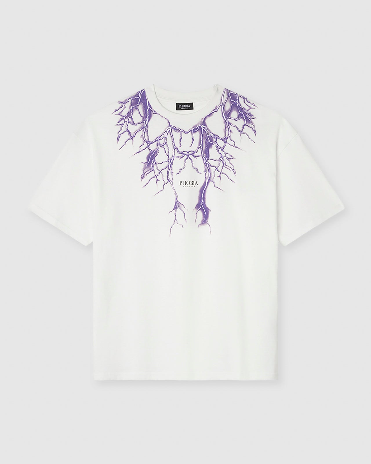 Questa t-shirt bianca in cotone presenta una audace stampa di fulmini in viola, insieme al logo. Realizzata pensando al comfort, questa maglietta aggiunge un tocco di colore al tuo guardaroba.