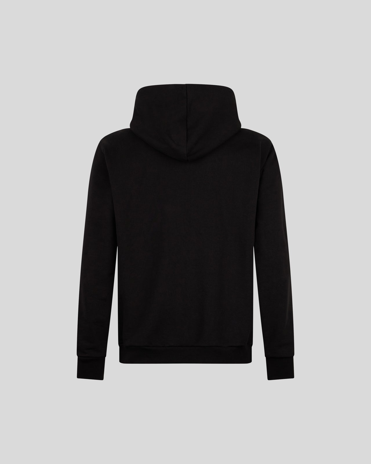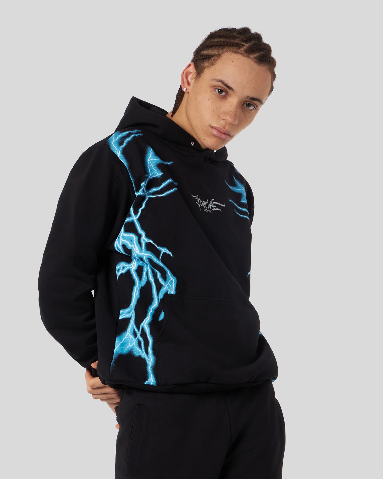 Black hoodie with silkscreen printed lateral light blue lightning graphics, embroidered gotic logo and metal button