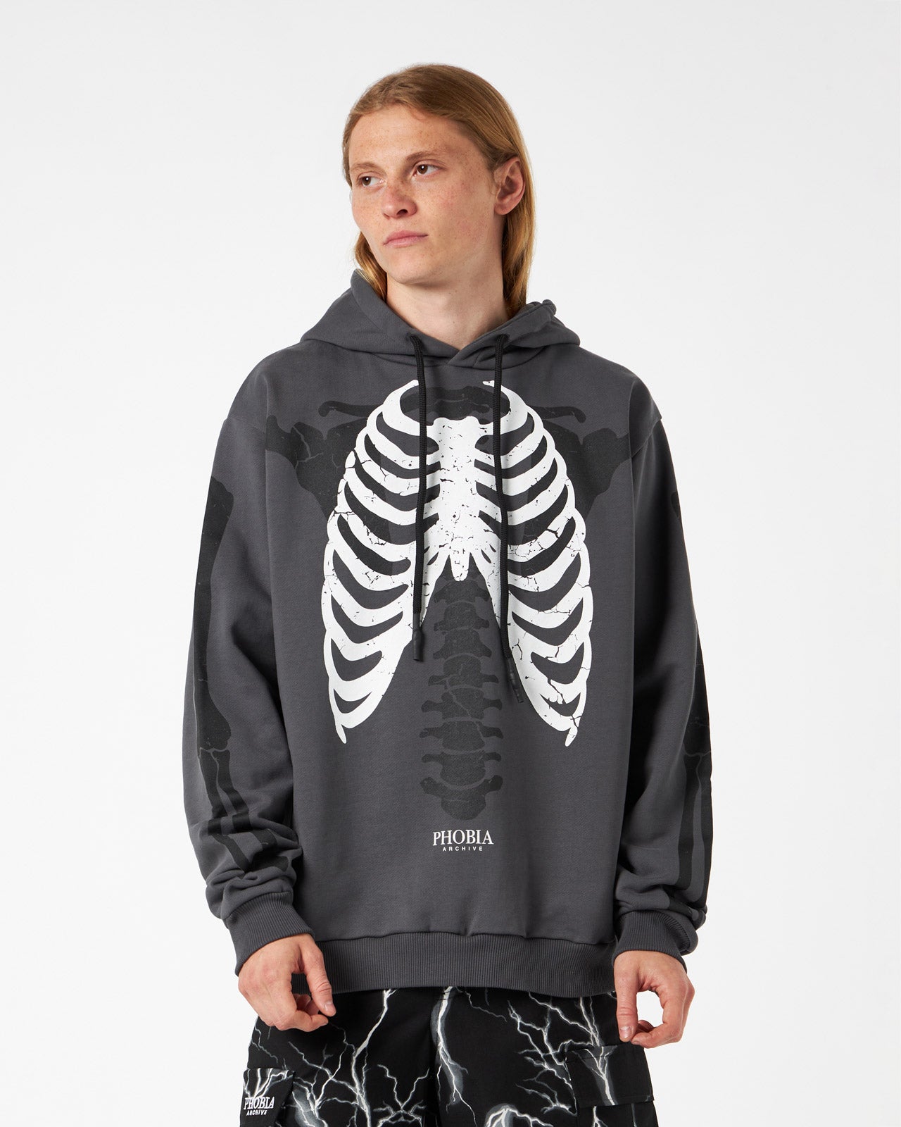 Grey Phobia Archive hoodie with silkscreen Skeleton printing placed on the front.